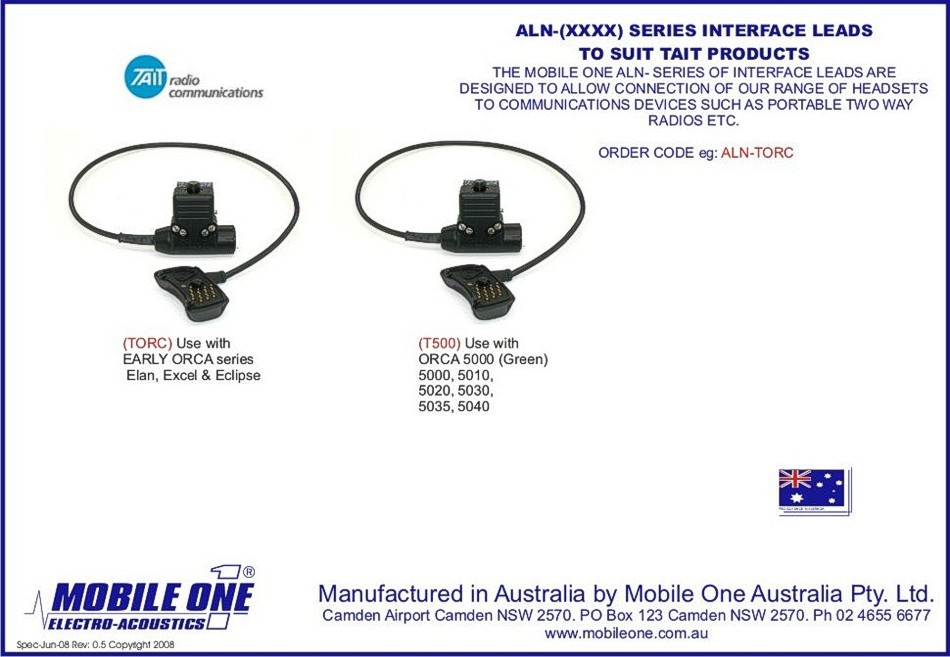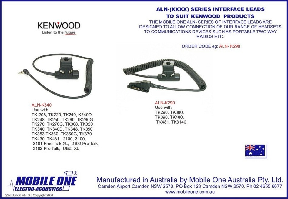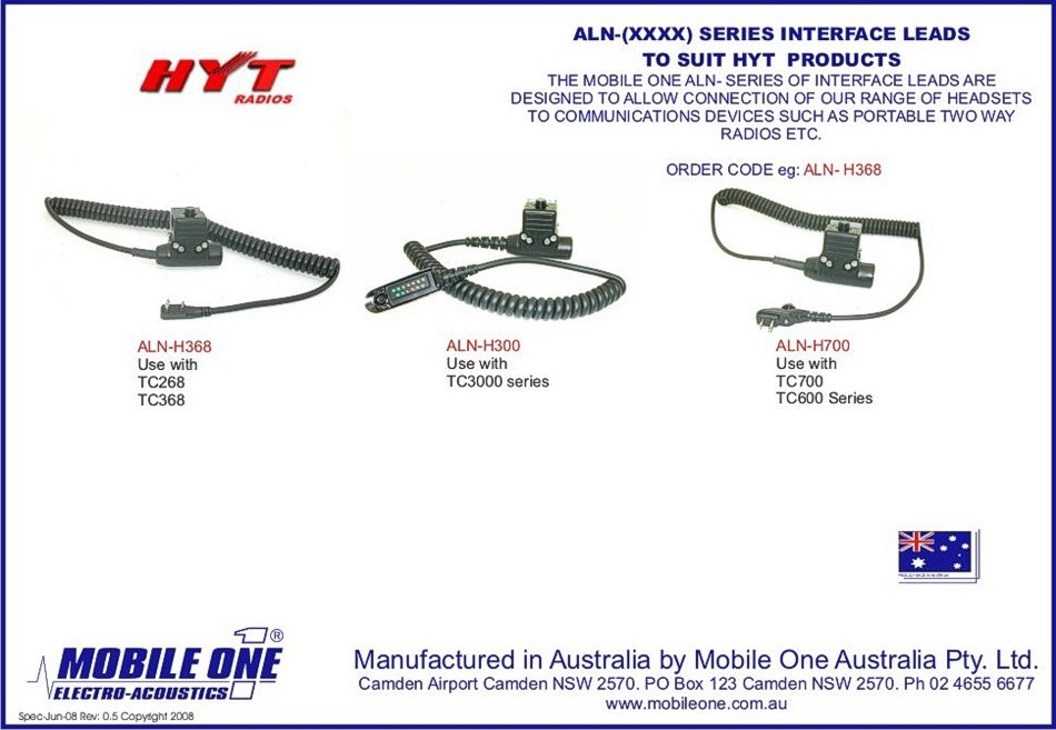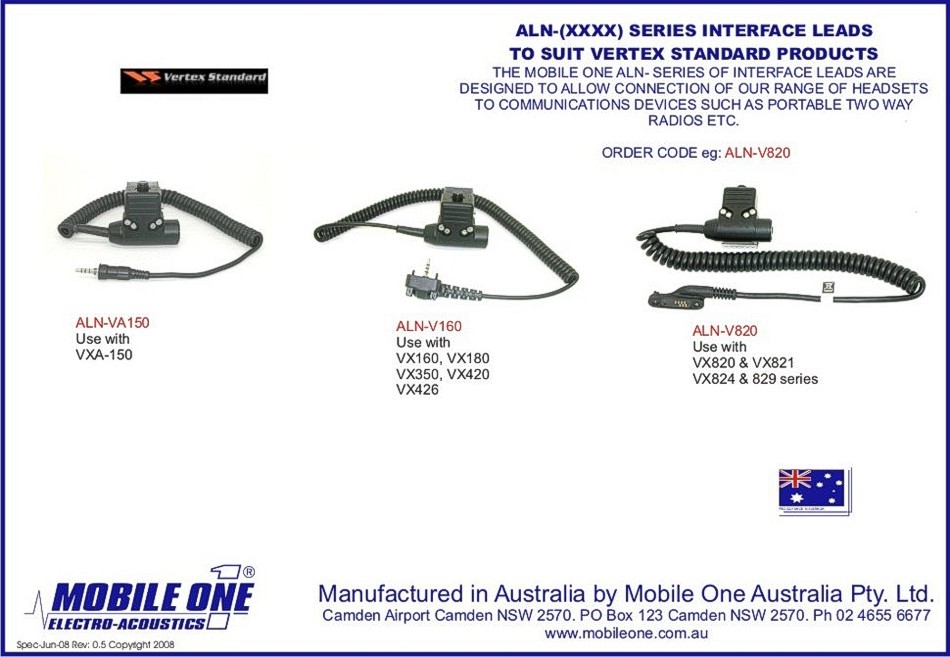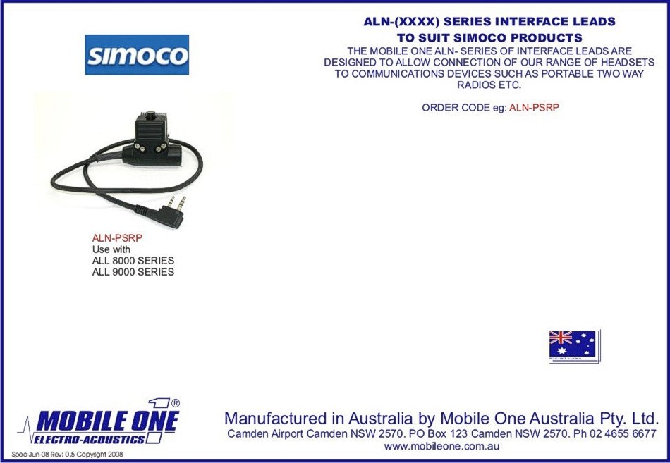 ALN-(XXXX) INTERFACE LEADS THE MOBILE ONE ALN- SERIES OF INTERFACE LEADS ARE DESIGNED TO ALLOW CONNECTION OF OUR RANGE OF HEADSETS TO COMMUNICATIONS DEVICES SUCH AS PORTABLE TWO WAY RADIOS AND MOBILE PHONES. EACH LEAD CONSISTS OF A NEXUS TJS-102 COMBINATION, PTT or HOOK SWITCH, SOCKET & HOUSING WITH A CLOTHING CLIP. LEAVING THE HOUSING IS A LENGTH OF COILED OR STRAIGHT CABLE WHICH TERMINATES TO A PLUG OR PLUG SET SUITABLE FOR DIRECT CONNECTION TO THE NOMINATED RADIO OR DEVICE.