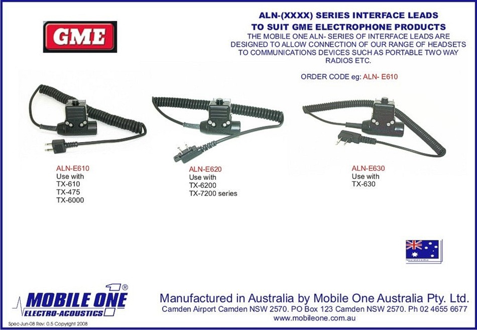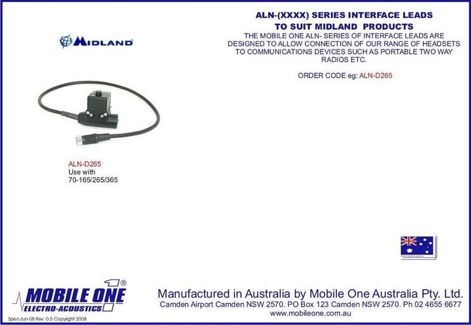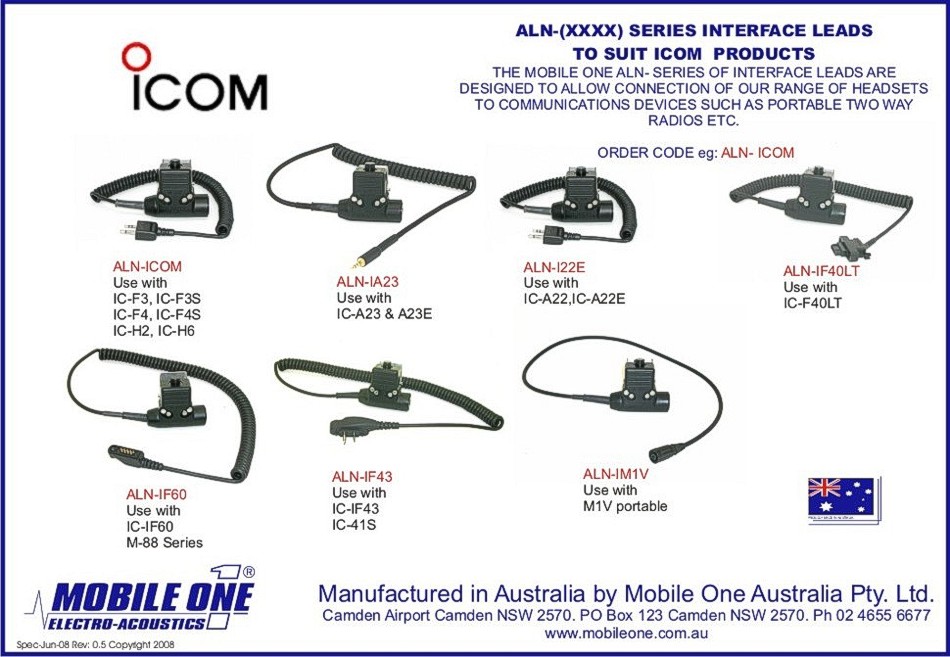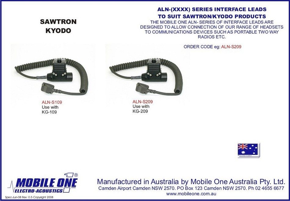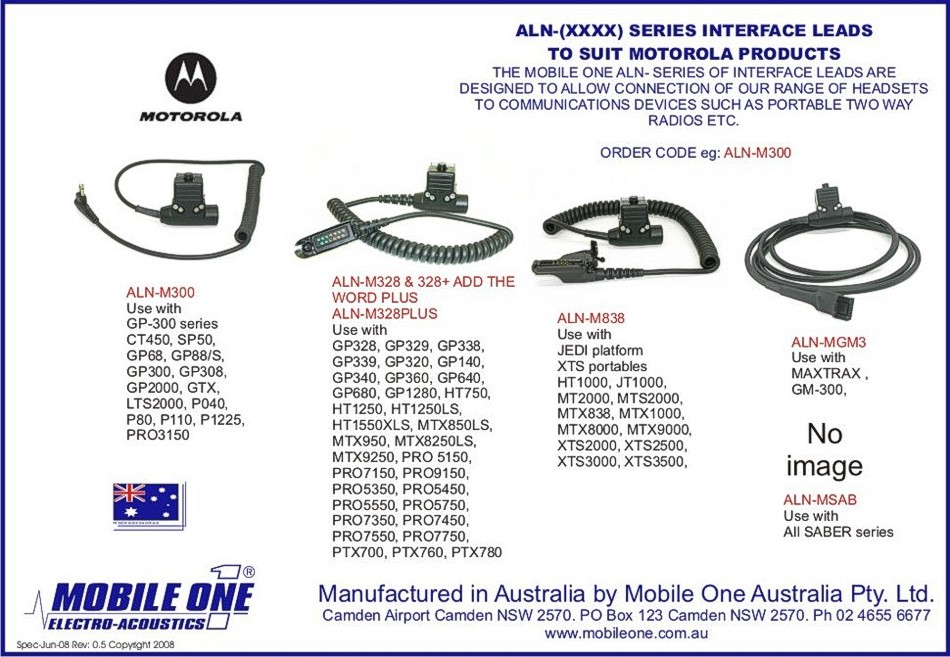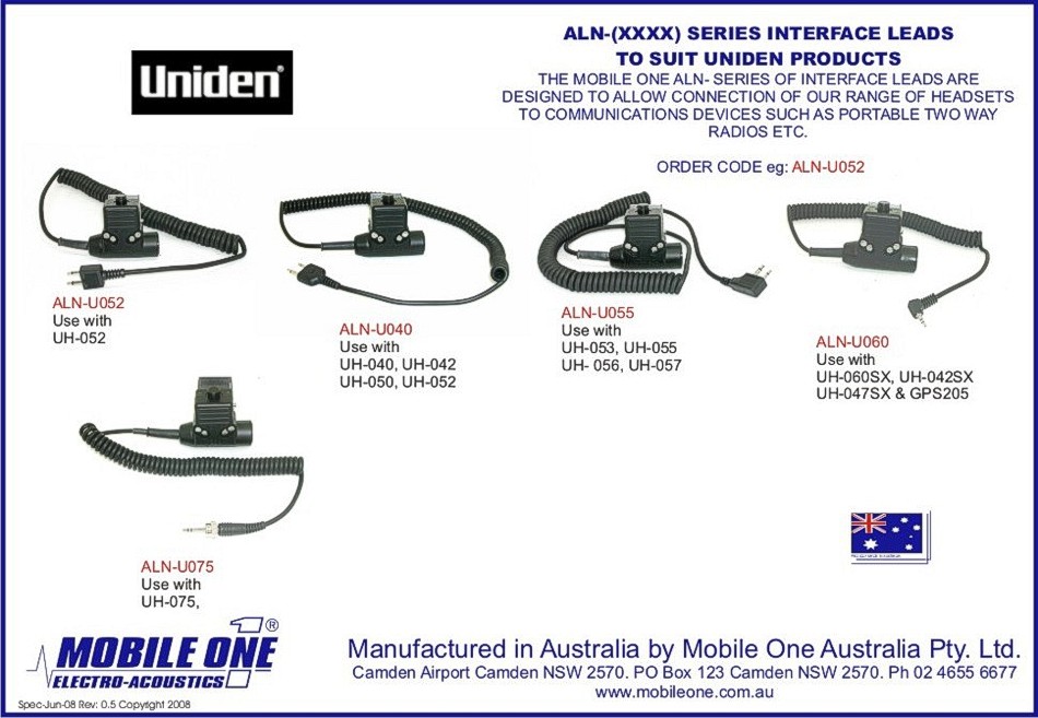 ALN-(XXXX) INTERFACE LEADS THE MOBILE ONE ALN- SERIES OF INTERFACE LEADS ARE DESIGNED TO ALLOW CONNECTION OF OUR RANGE OF HEADSETS TO COMMUNICATIONS DEVICES SUCH AS PORTABLE TWO WAY RADIOS AND MOBILE PHONES. EACH LEAD CONSISTS OF A NEXUS TJS-102 COMBINATION, PTT or HOOK SWITCH, SOCKET & HOUSING WITH A CLOTHING CLIP. LEAVING THE HOUSING IS A LENGTH OF COILED OR STRAIGHT CABLE WHICH TERMINATES TO A PLUG OR PLUG SET SUITABLE FOR DIRECT CONNECTION TO THE NOMINATED RADIO OR DEVICE.